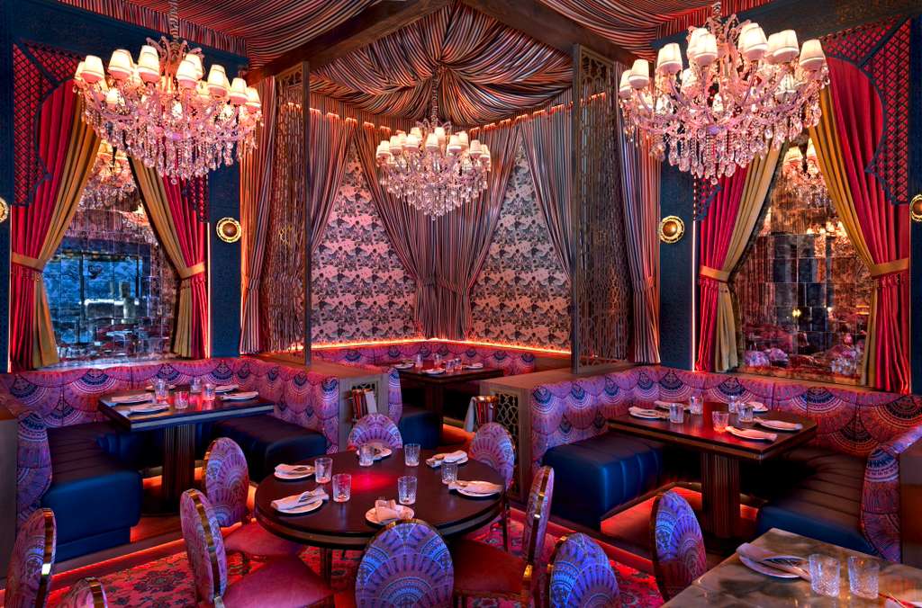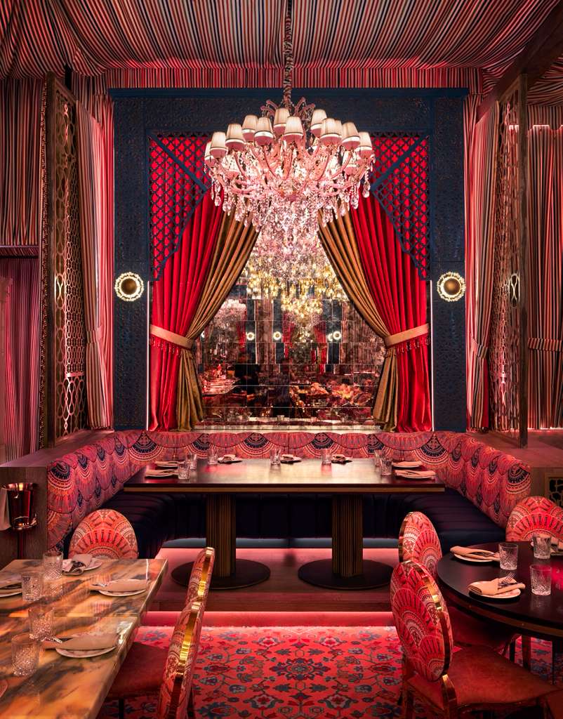 El espacio habita una estructura inspirada en carpas, con referencias a la arquitectura morisca y una estética que recuerda a los lujosos riads franceses de Marruecos. El diseño, desarrollado por Mark Lehmkuhl de Ghosthouse Design Group en colaboración con Love Lake Studios, envuelve a los visitantes en un ambiente vibrante y sofisticado, con una decoración retro inspirada en Wes Anderson, dominada por tonos rosados y verde azulado, evocando un Tangier de ensueño con espíritu vintage.